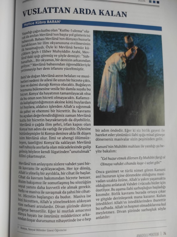 Anadolu Mektebi Yazar Okumaları kapsamında Türkiye genelinde yapılan Mevlana Okumaları etkinliğinde okulumuz mezun öğrencilerinden Hatice Kübra Baran'ın panel yazısı seçilerek "Anadolu Mektebi Edebiyat Dergisi'nde yayınlanmıştır.Öğrencimize teşekkür eder başarılarının devamını dileriz.