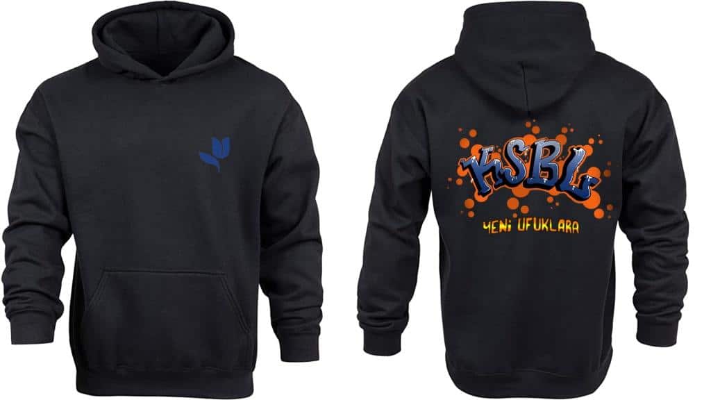 KAPÜŞONLU UZUN KOLLU TİŞÖRT (SWİTŞÖRT) : Kanguru modelinde geniş kalıp (over size) siyah renkte sol göğüs üzerinde mavi lale ve sırtta okul logosu basılı olacak.